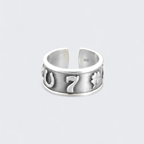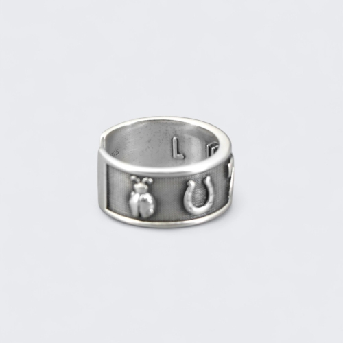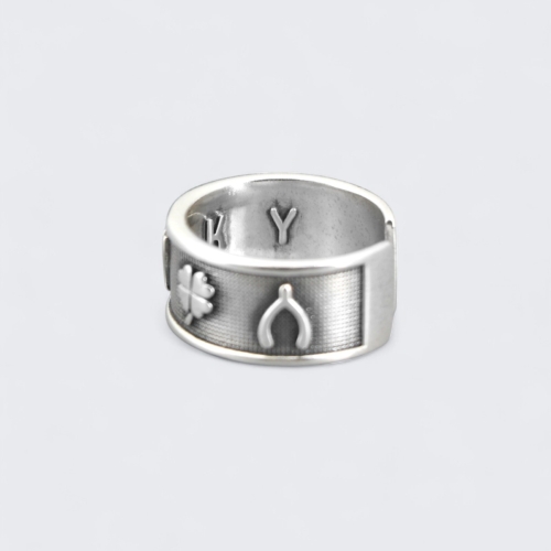 Carry a charm of positivity and good fortune wherever you go with this whimsical sterling silver lucky symbols ring. Embossed with iconic symbols of luck from across cultures, this ring is a wearable talisman designed to attract good vibes and hopeful energy. Whether you’re wishing on a four-leaf clover or holding tight to a lucky number, this piece brings lighthearted optimism to your everyday style.Key Features* Design: Decorated with raised lucky motifs including a ladybug, horseshoe, number 7, wishbone, and four-leaf clover* Adjustable Size: Adjustable band fits US ring sizes 6.5 to 9.5; 0.5 inch wide* Material: Solid 925 sterling silver with oxidized background and polished symbols* Features: Inner band is embossed with the word “Lucky”; open back for comfortable adjustabilityA playful and meaningful piece for anyone who enjoys a bit of magic and charm in their life. Great for daily wear, good luck gifts, or stacking with other symbolic rings.