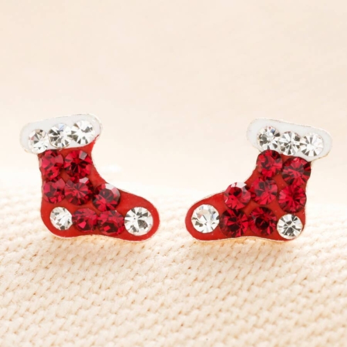 Sterling silver stud earrings with a festive stocking designWith a secure and comfortable butterfly back fasteningAccented with white crystal dots and delicate rim detailingA joyful Christmas gift for children who love festive accessoriesDimensions: width 0.7cm x height 0.6cmMade from: sterling silver