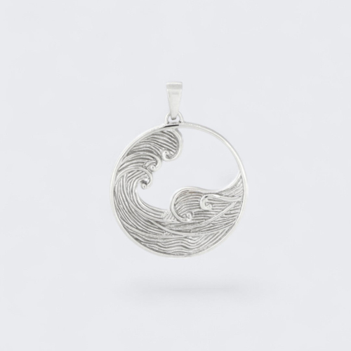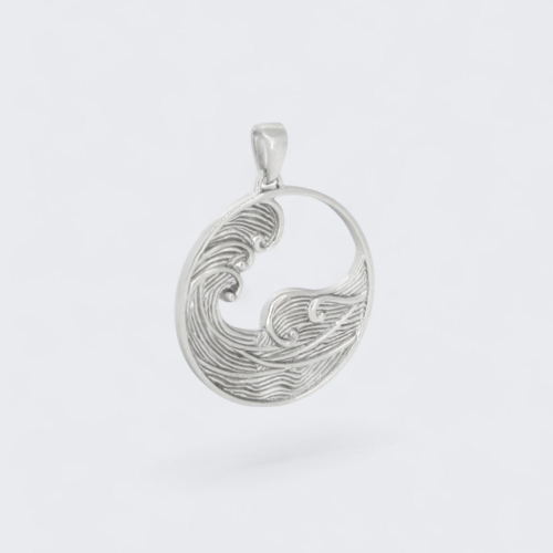 Inspired by the fluid rhythms of the sea, this sterling silver pendant captures the motion of ocean waves in a beautifully sculpted open-circle form. With its minimalist elegance and engraved textures, it brings a sense of calm and natural grace. The wave motif-both soothing and dynamic-evokes flow, transformation, and timeless connection to nature.Key Features* Design: Open-circle medallion with engraved wave pattern and raised texture, symbolizing fluidity and flow.* Size: Pendant measures approximately 0.9″ in diameter.* Material: Made from high-quality sterling silver with rhodium plating for added brilliance and tarnish resistance.* Features: Lightweight and elegant; ideal for solo wear or layering with other necklaces.* Pendant: Sold as a pendant. Chain sold separately.Whether worn daily as a gentle reminder of life’s ebb and flow or gifted as a symbol of serenity, this pendant offers timeless beauty with a mindful message.