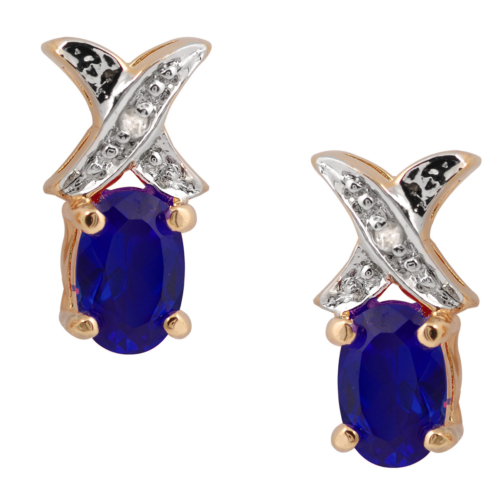 Elegant .925 Sterling silver rose gold plated sapphire cubic zirconia oval earrings. The clear cubic zirconia stones are arranged to form an x in this superb pair of earrings above sapphire blue cubic zirconia oval solitaire. Crafted of .925 Sterling silver with rhodium and gold plating and secure with butterfly closure.