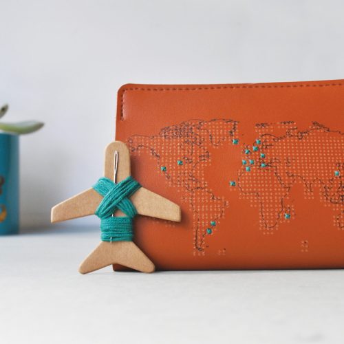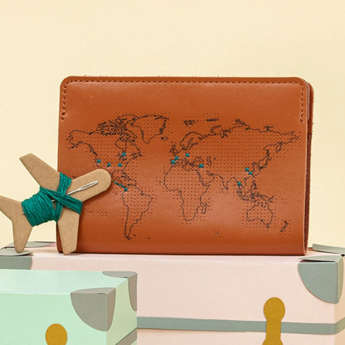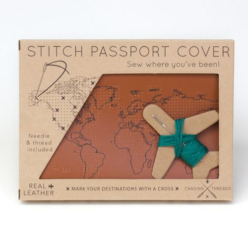 The leather passport cover is printed with the world map and specially perforated, so each country visited can be marked with a colourful cross. This beautiful brown passport cover come with a ‘travel’ needle and thread included, ready to be cross-stitched with global travels. It is very easy to stitch and an ideal gift for those off on a new adventure- even if they have not sewn before!
