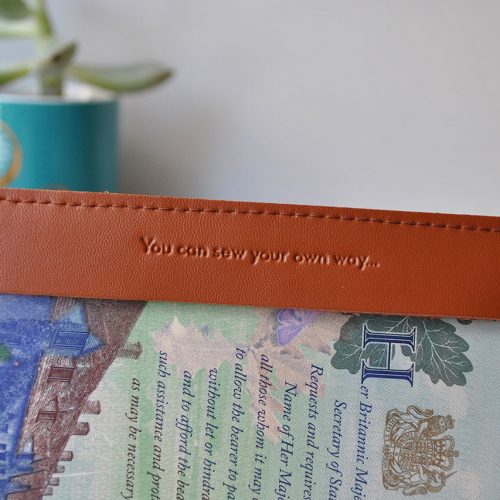 With gold embossed logo on the back and ‘Sew your own way’ and ‘Travel On’ debossed on the inside cover- it is a lovely quality travel accessory.