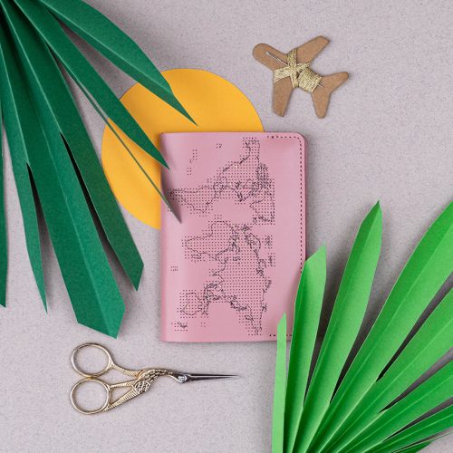 The leather passport cover is printed with the world map and specially perforated, so each country visited can be marked with a colourful cross. This beautiful pink passport cover come with a ‘travel’ needle and thread included, ready to be cross-stitched with global travels. It is very easy to stitch and an ideal gift for those off on a new adventure- even if they have not sewn before!