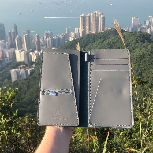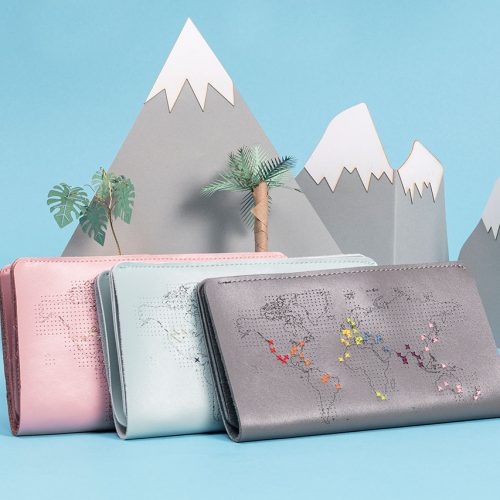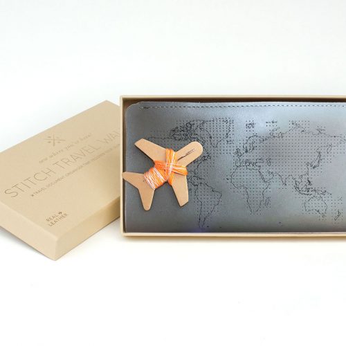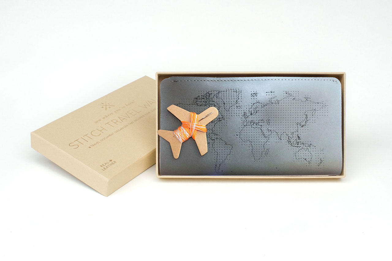 The grey wallet is printed with world map and comes with orange and silver thread & needle in gift box with gold foil detail.