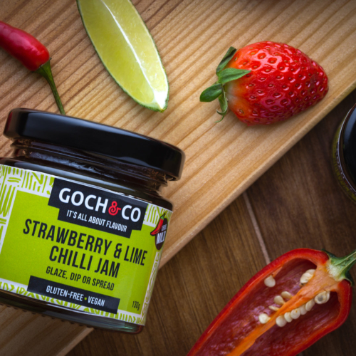 Strawberry & Lime Chilli Jam An award-winning, mild, and luscious fruity blend of strawberry and lime flavours, mildly spicy and great for cured meat, and cheese platters. Delicious when added to hot or cold puddings, bakes, bread, crumpets, and porridge. You can add to yogurt, desserts, cakes, muffins, and smoothies Gluten-free. No GM. No GMS. Vegetarian. Vegan. No Artificial Additives. Recyclable pack. Made in Wales, UK. Heat Level: Mild Servings per 100g: 20 Each Serving: 5g Ingredients: Strawberries (54%), Chilli Peppers, Limes, Sugar. Allergen Advice: For Allergens, including cereals containing gluten, see ingredients in BOLD. Produced in a facility that handles cereals and nuts. Nutrition: Typical Values 100g contains: Energy 810Kj/191Kcal Fat 0g of which Saturates 0g Carbohydrates 46g of which Sugars 46g Fibre 0.8g Protein 0.8g Salt 0g Country of origin: Wales, United Kingdom. Storage: Store in a cool and dry place.
