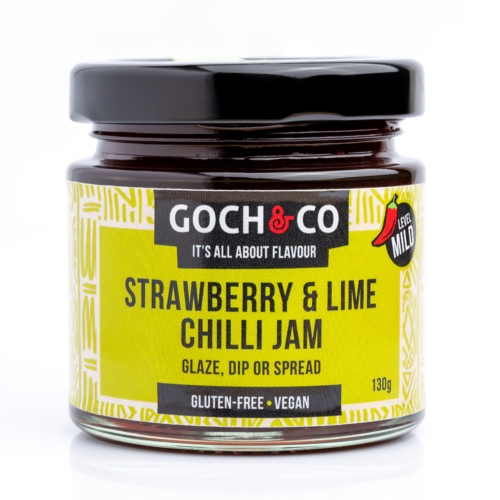 Strawberry & Lime Chilli Jam An award-winning, mild, and luscious fruity blend of strawberry and lime flavours, mildly spicy and great for cured meat, and cheese platters. Delicious when added to hot or cold puddings, bakes, bread, crumpets, and porridge. You can add to yogurt, desserts, cakes, muffins, and smoothies Gluten-free. No GM. No GMS. Vegetarian. Vegan. No Artificial Additives. Recyclable pack. Made in Wales, UK. Heat Level: Mild Servings per 100g: 20 Each Serving: 5g Ingredients: Strawberries (54%), Chilli Peppers, Limes, Sugar. Allergen Advice: For Allergens, including cereals containing gluten, see ingredients in BOLD. Produced in a facility that handles cereals and nuts. Nutrition: Typical Values 100g contains: Energy 810Kj/191Kcal Fat 0g of which Saturates 0g Carbohydrates 46g of which Sugars 46g Fibre 0.8g Protein 0.8g Salt 0g Country of origin: Wales, United Kingdom. Storage: Store in a cool and dry place.