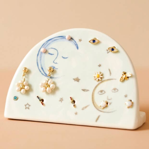 A celestial holder for your most loved earrings, we have designed this jewellery stand in-house to be popped on a dresser or bedside table.Featuring a sweet sun and moon design, there are 14 holes for earrings to be secured in to.Dimensionswidth 9cm x height 7cm x depth 2.5cmMade fromceramic