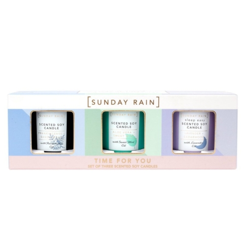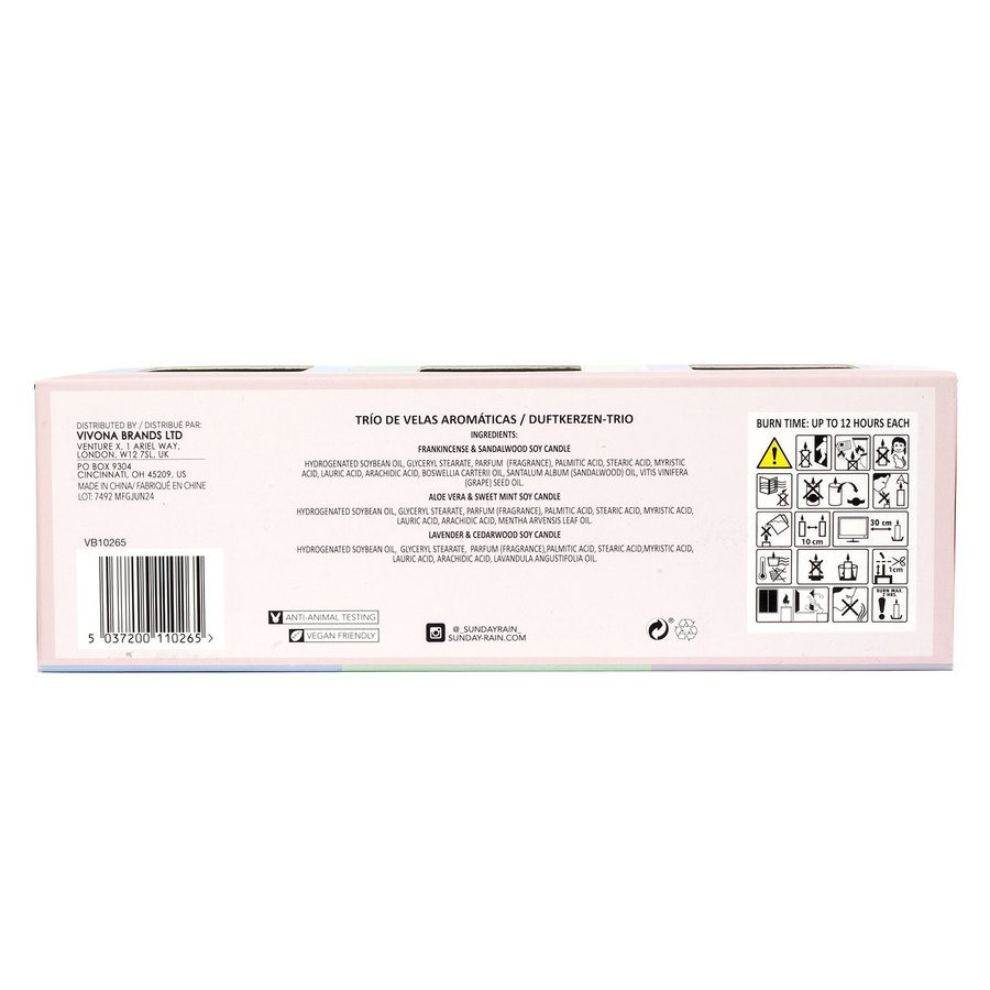 Perfect for creating a cozy atmosphere wherever you are! Relax and recharge with three mini soy scented candles to fill your home with relaxing scents. contains: Lavender & Cedarwood Soy Scented Candle 65 g Frankincense & Sandalwood Soy Scented Candle 65 g Aloe Vera & Sweet Mint Soy Scented Candle 65 g Key Ingredients: Lavender Oil: Known for its restorative properties for both mind and body. Frankincense: A warm and rich scent that helps calm the mind and soul. Sandalwood: With a lovely combination of earthy and sweet notes that draw you into its relaxing aroma. Sweet Mint Oil: Used in aromatherapy to help awaken and reduce stress in the mind, body and soul. NB. Never leave a burning candle unattended. Do not burn a candle on or near anything that can burn. Keep out of the reach of children and pets. Keep away from drafts. Remove packaging before use. Extinguish the flame with a candle snuffer, do not blow it out. Never use liquid to extinguish the light. Keep the candles at least 10 cm apart. Do not place lights on or near electronics. Do not touch as it may be hot. This candle is liquid, use a suitable container. Trim the wick to 1 cm. Ventilate the room after use. Avoid direct inhalation of smoke. Burn for a maximum of 2 hours.