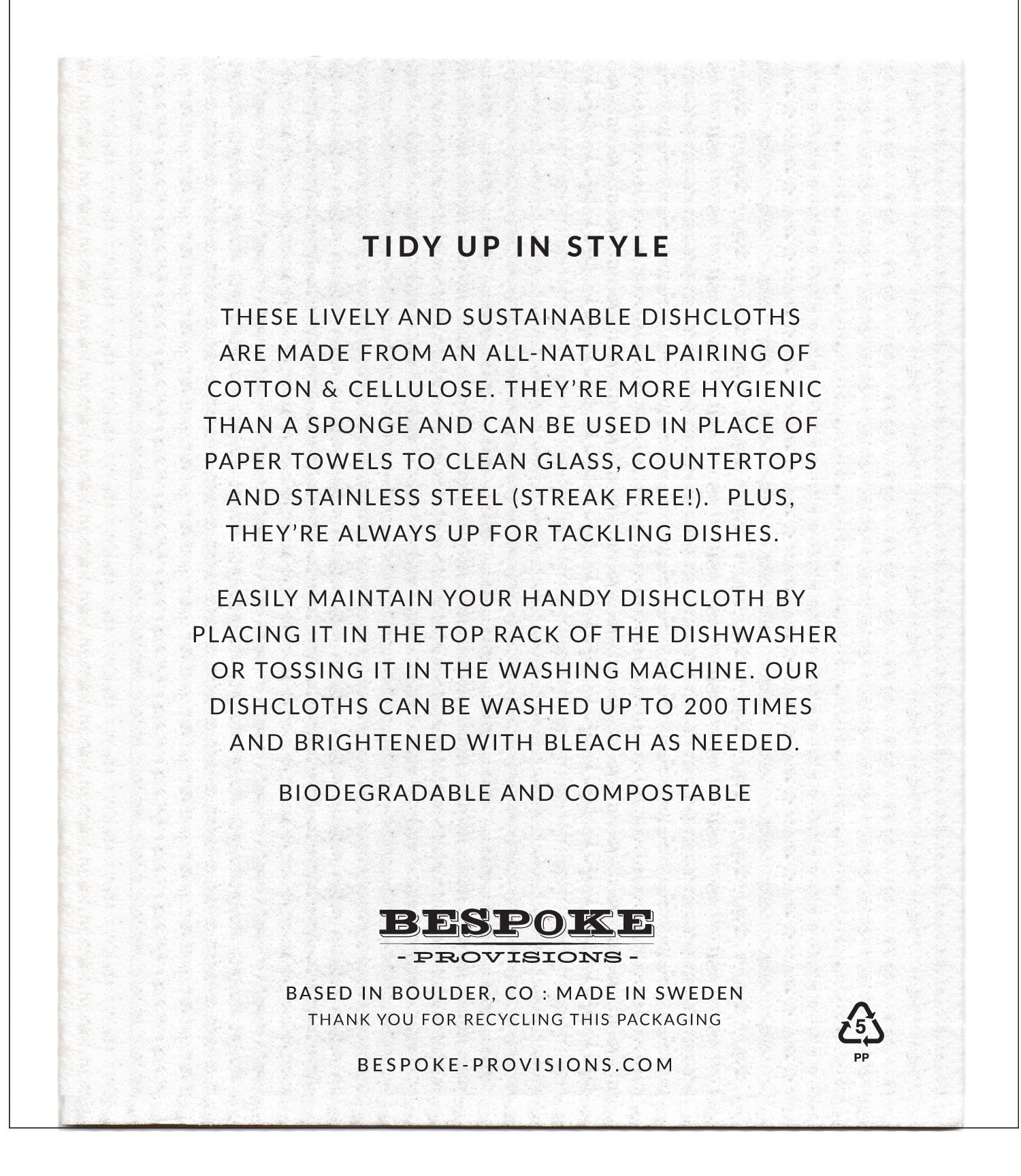 1. Packaged in a clear protective sleeve with printed text explaining how to use and care for the dishcloths.