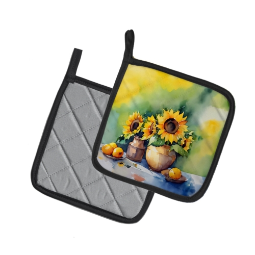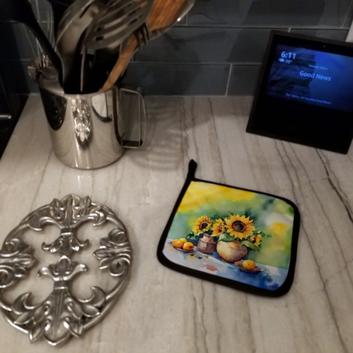 Pair of Pot Holders featuring breed specific Sunflowers artwork. A Pair of Pot Holders to match your kitchen decor. Made in the USA these are thick and functional. Full color artwork decorates the front polyester fabric of the hot pad and accented by a black trim. Use these at as a trivet for your Thanksgiving or Christmas tablescape. Filled with insulated fabric and quilted for durability. These colorful pot holders will make a great gift for your favorite home cook or executive chef. Each pot holder measures approximately 7 1/2 inches by 7 1/2 inches. A hanging tab is included.