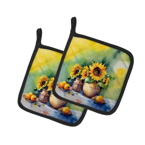 Pair of Pot Holders featuring breed specific Sunflowers artwork. A Pair of Pot Holders to match your kitchen decor. Made in the USA these are thick and functional. Full color artwork decorates the front polyester fabric of the hot pad and accented by a black trim. Use these at as a trivet for your Thanksgiving or Christmas tablescape. Filled with insulated fabric and quilted for durability. These colorful pot holders will make a great gift for your favorite home cook or executive chef. Each pot holder measures approximately 7 1/2 inches by 7 1/2 inches. A hanging tab is included.