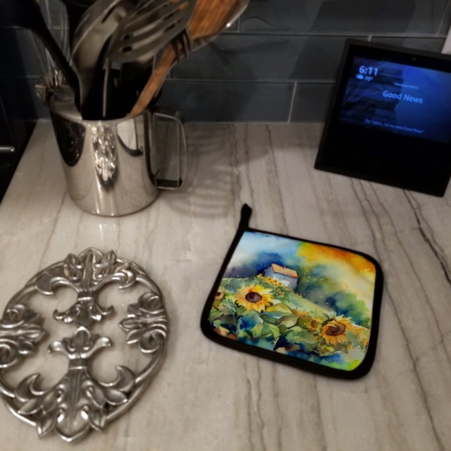 Pair of Pot Holders featuring breed specific Sunflowers artwork. A Pair of Pot Holders to match your kitchen decor. Made in the USA these are thick and functional. Full color artwork decorates the front polyester fabric of the hot pad and accented by a black trim. Use these at as a trivet for your Thanksgiving or Christmas tablescape. Filled with insulated fabric and quilted for durability. These colorful pot holders will make a great gift for your favorite home cook or executive chef. Each pot holder measures approximately 7 1/2 inches by 7 1/2 inches. A hanging tab is included.