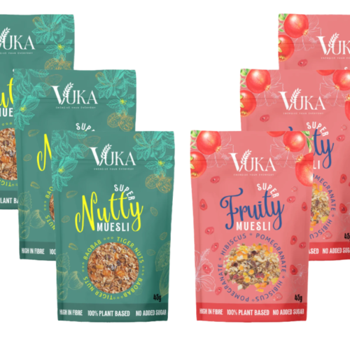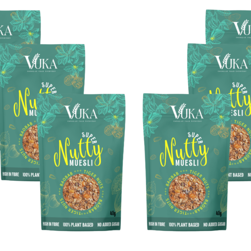 Uncover the delight of VUKA Super Muesli selection with sumptuous fusions of nutrient-packed ingredients that elevate your morning routine. Packed with antioxidants, our Super Fruity (45g x6 packs) and Nutty Muesli (45g x6 packs) blends toasted oats, pomegranate, hibiscus, baobab and tiger nuts to support gut health and tantalise your taste buds. Enjoy the delectable VUKA Muesli with yogurt, a dash of milk, and ripe berries for a delightful breakfast treat that nourishes and satisfies. INGREDIENTS OAT flakes, fibre, Vitamin B1, Riboflavin, Vitamin B5 and Vitamin B6, Zinc, Selenium, RYE flakes, fibre, Vitamin B1, Vitamin B3, Vitamin B5 and Vitamin B6, Vitamin B9, Zinc, Selenium, Pumpkin seeds, sunflower seeds, Salvia hispanica, Sultanas, Sunflower Oil, WALNUTS, ALMONDS Raisins, Apricot, Dates, Rice flour, Tiger nuts, Baobab, Hibiscus, Vitamin C, Calcium, Iron (Fe), Vitamin B6, Pomegranate, Riboflavin, Niacin, Thiamin, Vitamin C, Folate Vitamin E, Vitamin K, Spices. ALLERGY ADVICE: Allergens including cereals containing gluten, see ingredients in bold. May contain nuts, sesame, soya, gluten, and lupins DIETARY ADVICE: Suitable for vegans and vegetarians. No artificial colours, flavourings, or preservatives. No palm oil. No GMO, No GM. No dairy. WARNING: Children can choke on shells. Although every effort has been made to remove the shell, small fragments may remain. NUTRITIONAL & VITAMINS AVERAGE VALUES PER 100g PER 45g %*RI PER SERVING SERVING Energy 1738J / 414kcal 782kJ / 186kcal 9% Fat: 12g 5.5g 8% of which saturates 1.8g 0.8g 4% Carbohydrates: 58g 26g 10% of which sugars 4.4g 2g 4% Fibre 8.4g 3.8g Protein 13g 5.9g 12% Salt 0g 0g 0% *RI = Reference Intake of an average adult (8400kJ/2000kcal) Average 1 portion per pack STORAGE: Store in a dry place, away from sunlight. Once open store upright and in an airtight container.