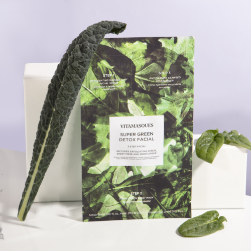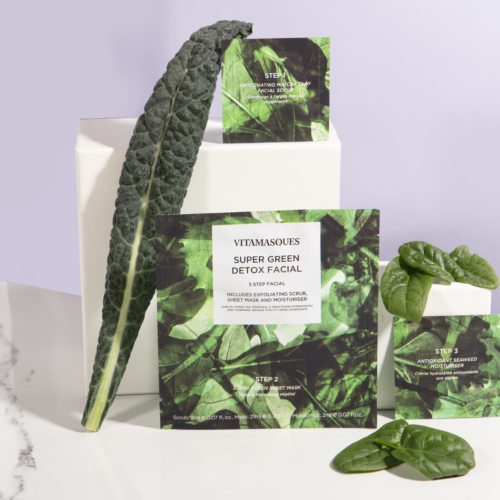 Step one contains an oxygenating Matcha-clay facial scrub followed by step 2 our Super-Green sheet mask and the final step is an Anti-oxidant Seaweed Moisturiser for a full detox and hydrating combination.