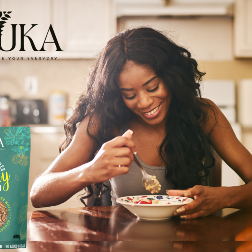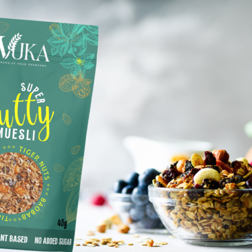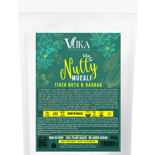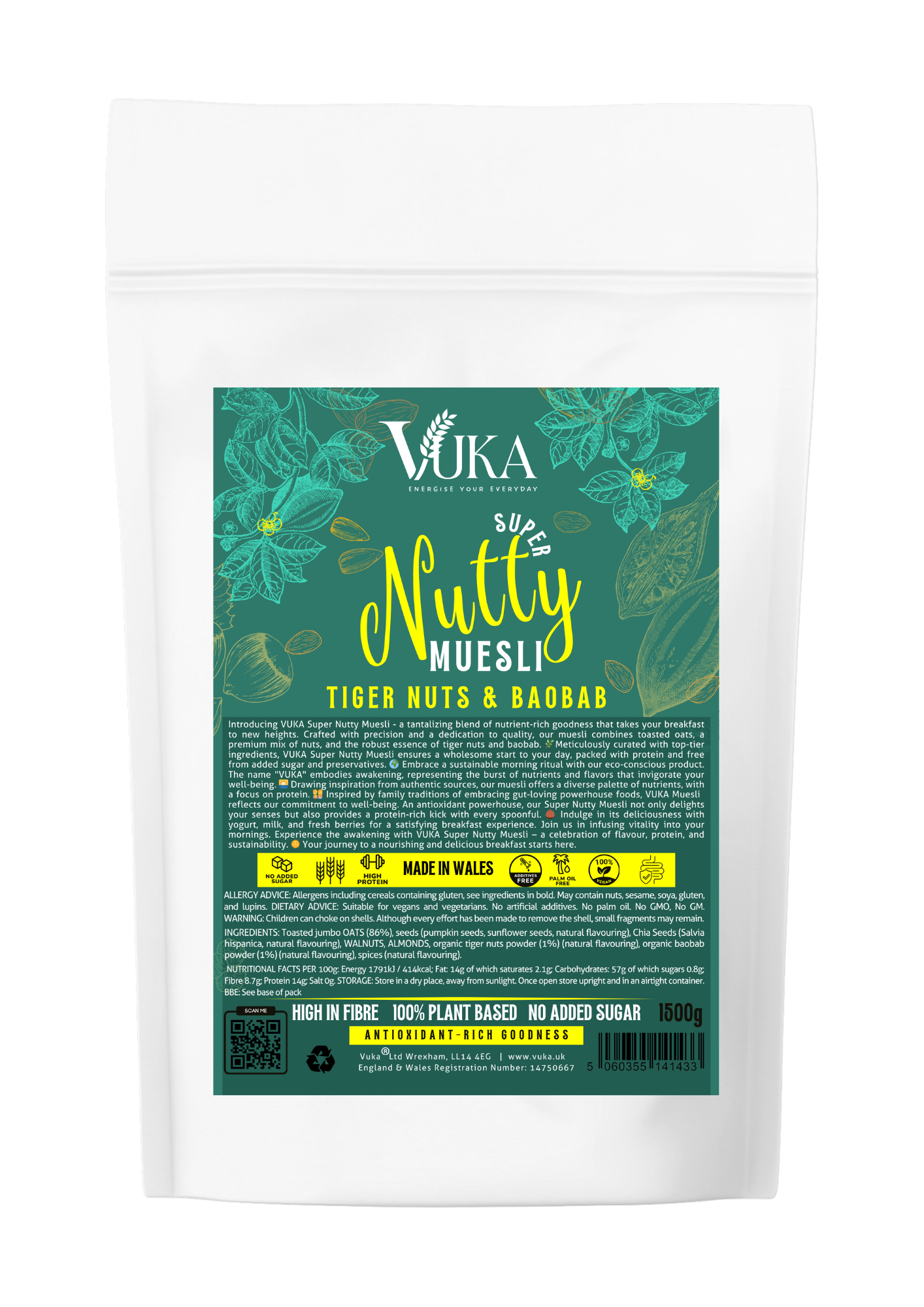 Introducing VUKA Super Nutty Muesli – a tantalizing blend of nutrient-rich goodness elevating your breakfast. Crafted with precision, it combines toasted oats, premium nuts, tiger nuts, and baobab. Meticulously curated with top-tier ingredients, it offers a wholesome, protein-packed start, free from added sugar and preservatives. Embrace a sustainable morning ritual with our eco-conscious product. “VUKA” symbolizes awakening, reflecting its nutrient-rich burst. Inspired by family traditions, it focuses on gut-loving powerhouse foods. An antioxidant powerhouse, it delights your senses and offers a protein-rich kick. Enjoy with yogurt, milk, and berries for a satisfying breakfast. Experience the awakening with VUKA Super Nutty Muesli – celebrating flavour, protein, and sustainability. Your journey to a nourishing breakfast starts here. INGREDIENTS: Toasted jumbo OATS (86%), seeds (pumpkin seeds, sunflower seeds, natural flavouring), Chia Seeds (Salvia hispanica, natural flavouring), WALNUTS, ALMONDS, organic tiger nuts (natural flavouring), organic baobab (natural flavouring), spices (natural flavouring). ALLERGY ADVICE: Allergens including cereals containing gluten, see ingredients in bold. May contain nuts, sesame, soya, gluten, and lupins DIETARY ADVICE: Suitable for vegans and vegetarians. No artificial colours, flavourings, or preservatives. No palm oil. No GMO, No GM. No dairy. WARNING: Children can choke on shells. Although every effort has been made to remove the shell, small fragments may remain. NUTRITIONAL & VITAMINS AVERAGE VALUES PER 100g PER 45g SERVING %*RI PER SERVING Energy 1791J /427kcal 806kJ /192kcal 10% Fat: 14g 6.3g 9% of which saturates 2.1g 0.9g 5% Carbohydrates: 57g 26g 10% of which sugars 0.8g 0g 0% Fibre 8.7g 3.9g Protein 14g 6.2g 13% Salt 0g 0g 0% *RI = Reference Intake of an average adult (8400kJ/2000kcal)Average 34 portions per pack STORAGE: Store in a dry place, away from sunlight. Once open store upright and in an airtight container. Made in Wrexham, Wales.