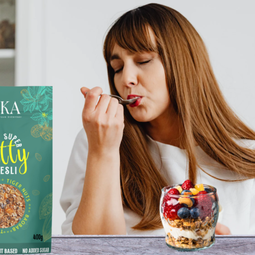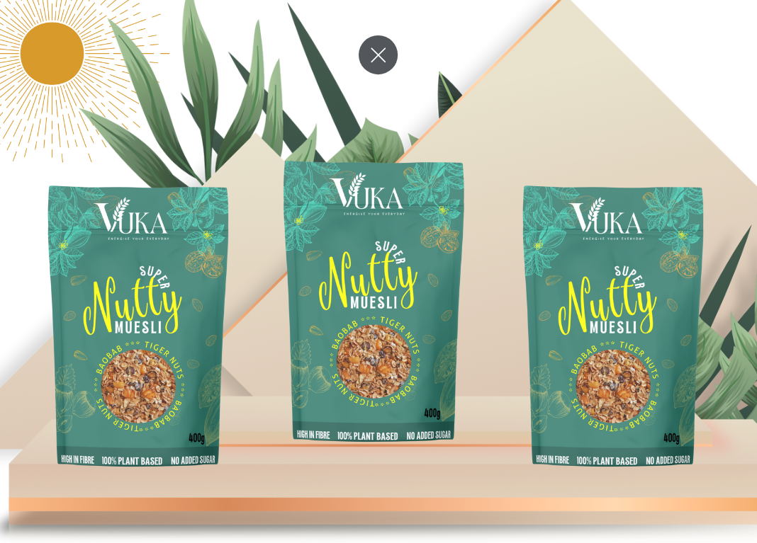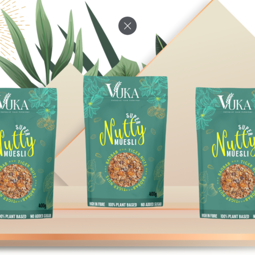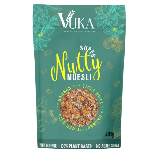 Introducing VUKA Super Nutty Muesli – a tantalising blend of nutrient-rich goodness that elevates your breakfast experience. Crafted with precision, our muesli combines toasted oats, a premium mix of nuts, and the robust essence of tiger nuts and baobab. Meticulously curated with top-tier ingredients, VUKA Super Nutty Muesli ensures a wholesome start to your day, packed with protein and free from added sugar and preservatives. Embrace a sustainable morning ritual with our eco-conscious product. The name “VUKA” embodies awakening, representing the burst of nutrients and flavours that invigorate your well-being. Drawing inspiration from authentic sources, our muesli offers a diverse palette of nutrients, with a focus on protein. Inspired by family traditions of embracing gut-loving powerhouse foods, VUKA Muesli reflects our commitment to well-being. An antioxidant powerhouse, our Super Nutty Muesli not only delights your senses but also provides a protein-rich kick with every spoonful. Indulge in its deliciousness with yogurt, milk, and fresh berries for a satisfying breakfast experience. Join us in infusing vitality into your mornings. Experience the awakening with VUKA Super Nutty Muesli – a celebration of flavour, protein, and sustainability. Your journey to a nourishing and delicious breakfast starts here. INGREDIENTS: Toasted jumbo OATS (86%), seeds (pumpkin seeds, sunflower seeds, natural flavouring), Chia Seeds (Salvia hispanica, natural flavouring), WALNUTS, ALMONDS, organic tiger nuts (natural flavouring), organic baobab (natural flavouring), spices (natural flavouring). ALLERGY ADVICE: Allergens including cereals containing gluten, see ingredients in bold. May contain nuts, sesame, soya, gluten, and lupins DIETARY ADVICE: Suitable for vegans and vegetarians. No artificial colours, flavourings, or preservatives. No palm oil. No GMO, No GM. No dairy. WARNING: Children can choke on shells. Although every effort has been made to remove the shell, small fragments may remain. NUTRITIONAL & VITAMINS AVERAGE VALUES PER 100g PER 45g SERVING %*RI PER SERVING Energy 1791J /427kcal 806kJ /192kcal 10% Fat: 14g 6.3g 9% of which saturates 2.1g 0.9g 5% Carbohydrates: 57g 26g 10% of which sugars 0.8g 0g 0% Fibre 8.7g 3.9g Protein 14g 6.2g 13% Salt 0g 0g 0% *RI = Reference Intake of an average adult (8400kJ/2000kcal)Average 9 portions per pack STORAGE: Store in a dry place, away from sunlight. Once open store upright and in an airtight container. Made in Wrexham, Wales.