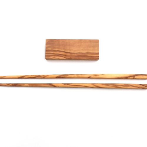 The set of sushi chopsticks is made of olive wood and handmade, making each piece unique. The chopsticks with holder for storage are ideal as cutlery for many Asian dishes. The square shape simplifies handling. Dimensions in approx. information: Sushi sticks: L 23 cm Holder: L 8 x W 3 x 1 cm Each item is unique and differs not only in the shape/dimensions, but also in the grain/color. Clean the unique item with water and, if necessary, a little washing-up liquid. Rub with a little vegetable oil at regular intervals. Not suitable for dishwashers.