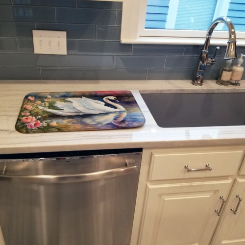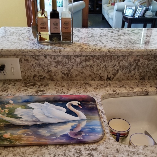 Dish Drying Mat featuring breed specific Swan artwork. Say goodbye to messy countertops and soggy dish towels with our innovative dish drying mat. Our high-quality dish drying pad is designed to keep your countertops dry while offering a stylish and efficient solution. Whether you’re air drying dishes, glasses, stemware, silverware, pots, pans, bottles, or even fruits and vegetables, our dish mat is the perfect choice. The 14 inches x 22 inches size fits most counters and dish drying racks, and the non-slip design ensures stability. Made with water-absorbent polyester and a polyurethane foam insert, our dish drying mat is not only functional but also durable. It’s machine washable and printed in the USA for long-lasting use. The beautiful artwork adds flair to your kitchen decor, making it a perfect housewarming gift or present for any occasion. Upgrade your kitchen experience with our absorbent and versatile dish drying mat.