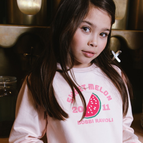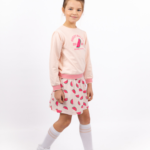 Deze meisjes sweater met pofmouw en meloenprint is een echte must-have dit voorjaar. De sweater is gebrusht van binnen en voelt daardoor heerlijk zacht aan. De sweater heeft gestreepte contrasterende boorden.