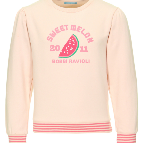 Deze meisjes sweater met pofmouw en meloenprint is een echte must-have dit voorjaar. De sweater is gebrusht van binnen en voelt daardoor heerlijk zacht aan. De sweater heeft gestreepte contrasterende boorden.