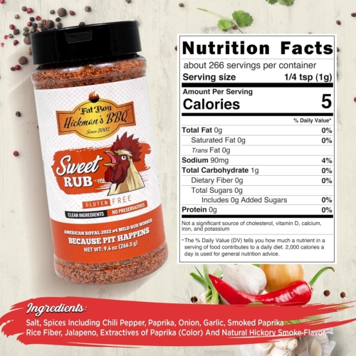 Ingredients: Sugar, Salt, Spices Including Chili Pepper, Molasses Powder (Molasses And IP Maltodextrin), Dietary Fiber, Onion, Garlic, Paprika, Jalapeno, Extractives of Paprika (Color) and Natural Hickory Smoke Flavor.