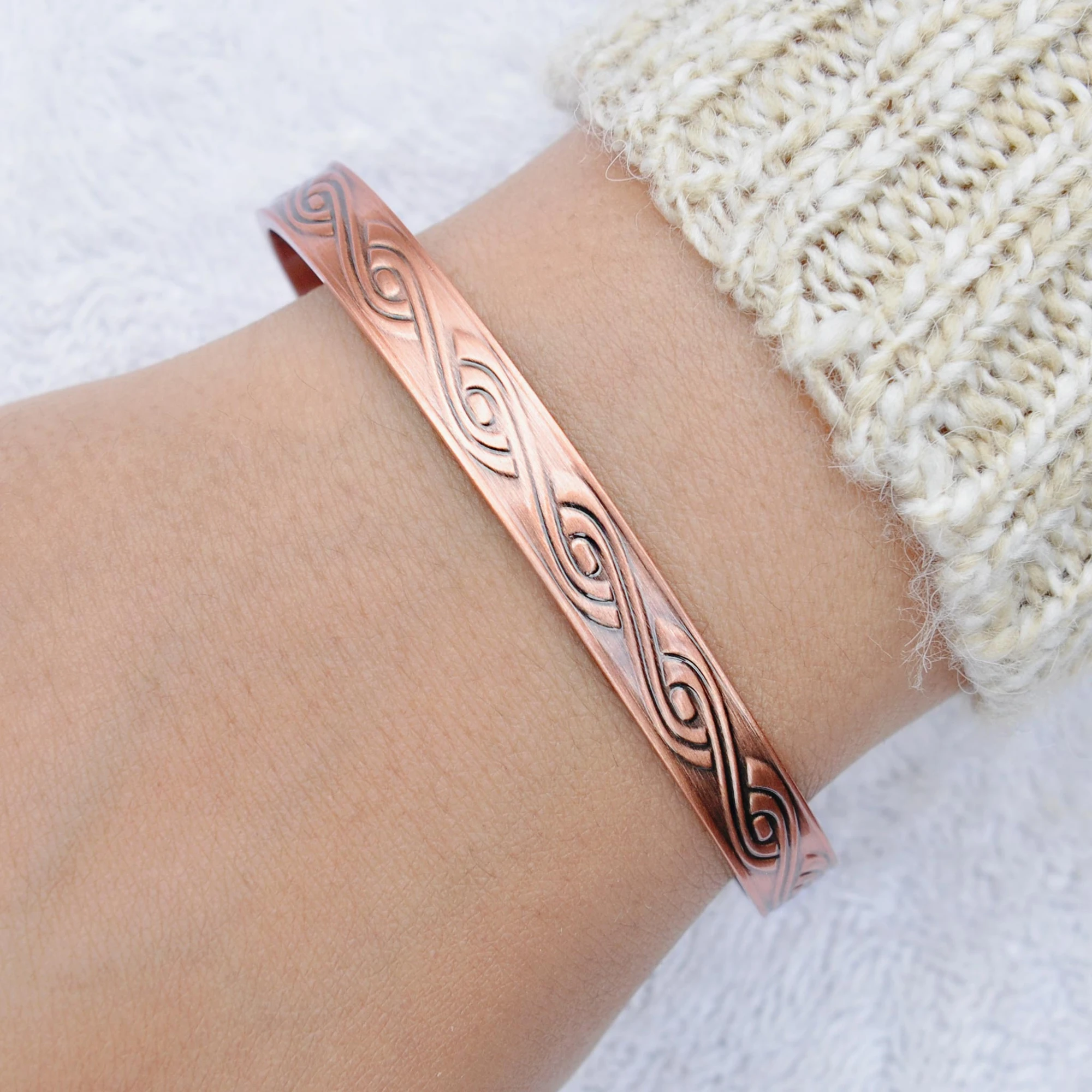 This graceful copper bracelet for ladies has all the details that make this magnetic bracelet elegant, sophisticated and timeless. This copper bracelet is more designed like a copper bangle with swirls of wave type patterns and light and dark oxidised copper make this ladies bracelet extra intriguing.