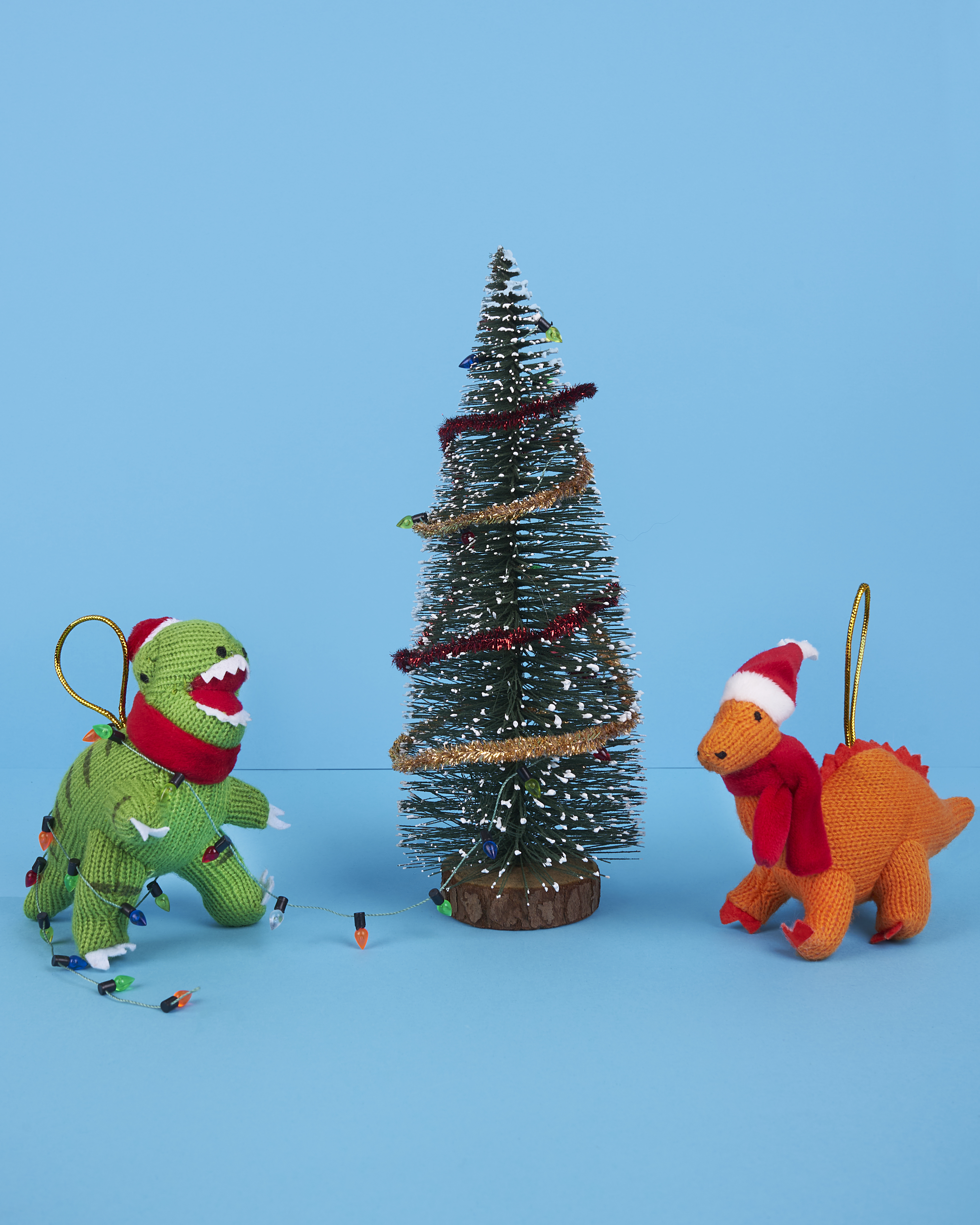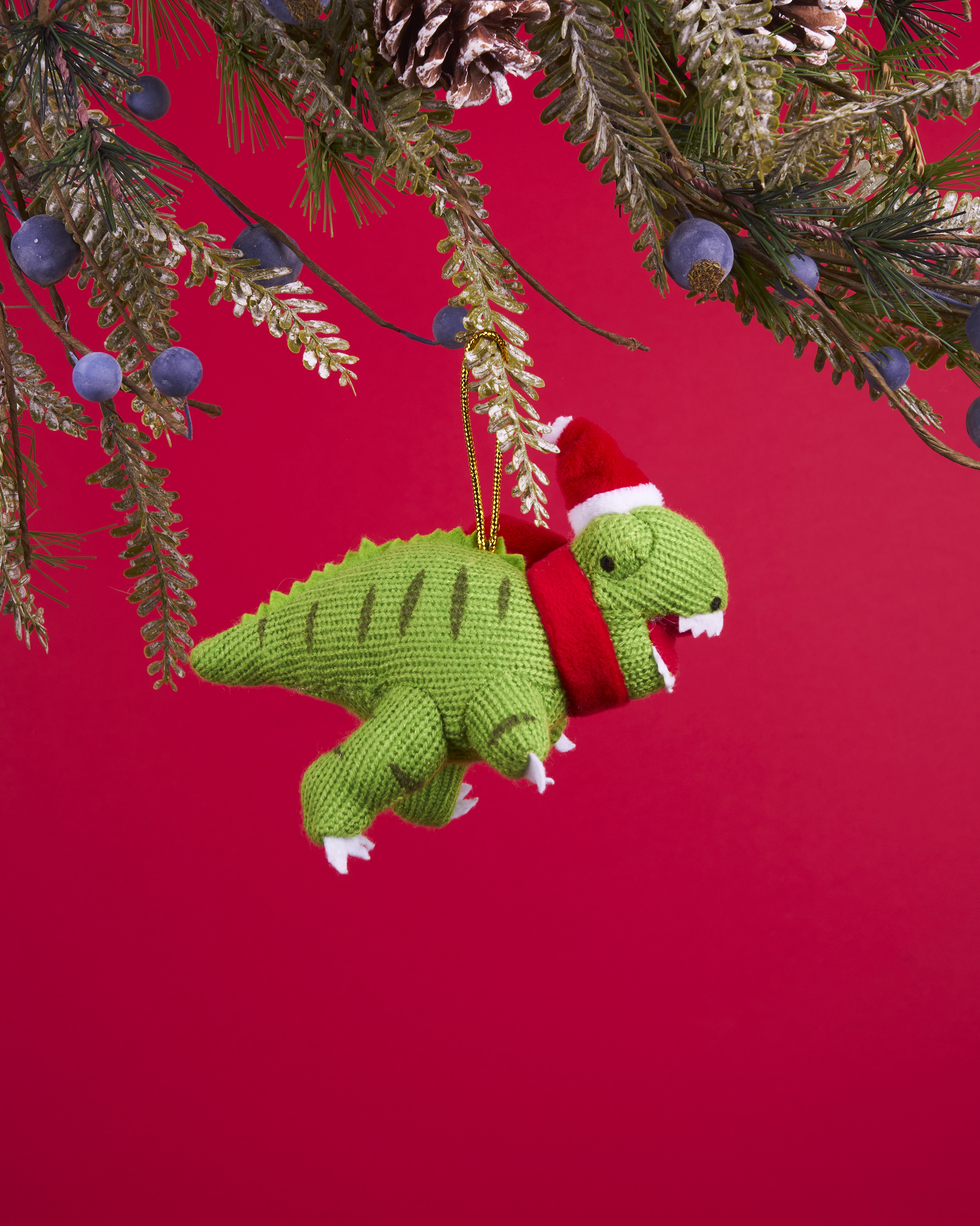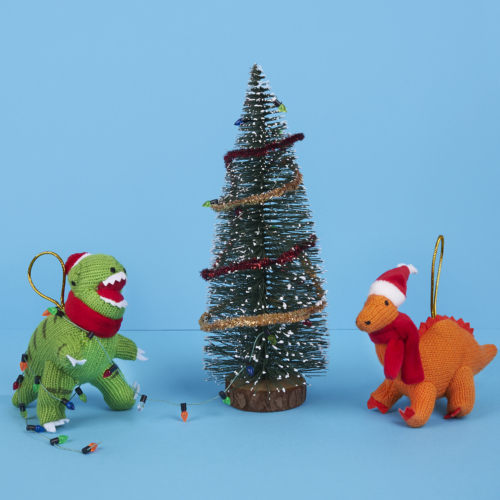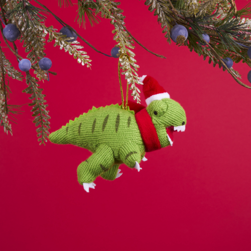 Part of a range of exclusive knitted Christmas tree decorations our green T Rex dinosaur soft toy now available as Christmas decor.