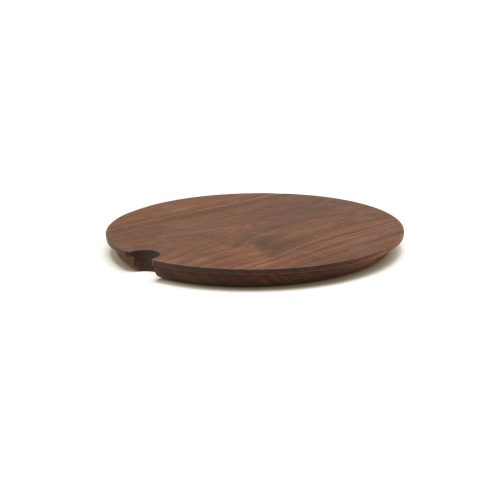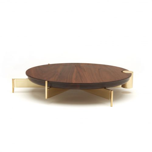 The base is made out of brass plated steel. The board is solid MFC certified Walnut wood finished with a combination of coconut oil and wax.