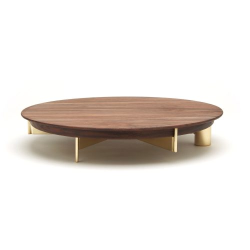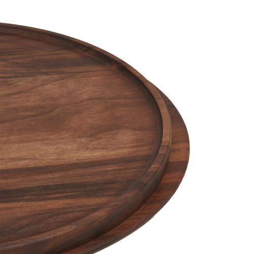 The base is made out of brass plated steel. The board is solid MFC certified Walnut wood finished with a combination of coconut oil and wax.