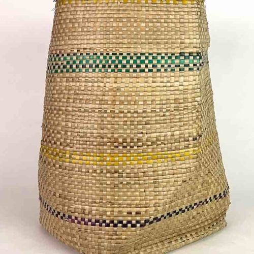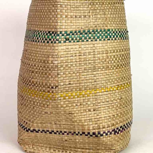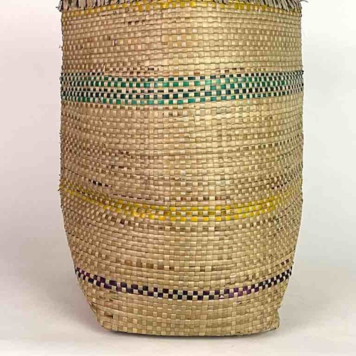Handwoven from local swampgrass in the lowlands of coastal Togo, West Africa this baskets is the natural color of the straw, decoratively accented with dark green vertical stripes. This basket is not a replica: it is a one of a kind product, originally made for local tribal use. The Mina people in this area of Africa use this basket to carry just about anything they need to carry, to store items and to keep items available in markets for sale. This basket is 18″ tall (46 cm) x 10″ top opening diam. (25.4 cm) x 14″ widest diameter (35.5″)