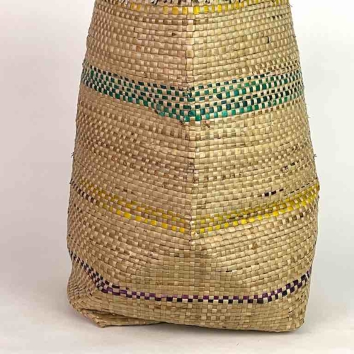 Handwoven from local swampgrass in the lowlands of coastal Togo, West Africa this baskets is the natural color of the straw, decoratively accented with dark green vertical stripes. This basket is not a replica: it is a one of a kind product, originally made for local tribal use. The Mina people in this area of Africa use this basket to carry just about anything they need to carry, to store items and to keep items available in markets for sale. This basket is 18″ tall (46 cm) x 10″ top opening diam. (25.4 cm) x 14″ widest diameter (35.5″)