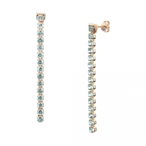 This pair of classic and eye-catching earrings feature round, perfect pearl-size natural blue topaz gemstones that line up neatly on two 18 ct Rose Gold Vermeil earrings with 15 blue topaz gemstones each side.