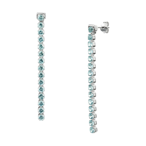 This pair of eye-catching earrings feature round, perfect pearl-size natural blue topaz gemstones that line up neatly on two sterling silver earrings with 15 blue topaz gemstones each side.