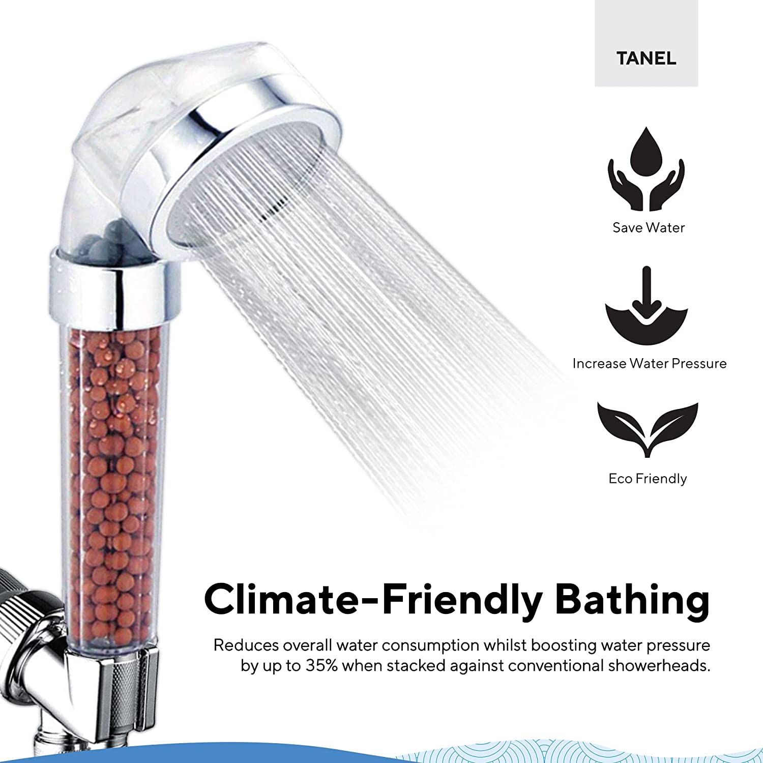 Climate-Friendly Bathing – Our multifunctional showerhead reduces overall water consumption whilst boosting water pressure by up to 35% when stacked against conventional showerheads.