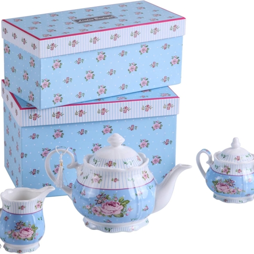 Tea Coffee Family Set for Mothers Day Coronation Party- 3 Tier Cake Stand, Teapot, Milk Jug, Sugar Bowl, 4 Plates, 4 Cups/ 4 Saucers (Blue)A very rare opportunity to acquire this party set at a discounted price- 3 Tier Cake Stand (£26.75)- 4 Cake Plates (26.75)- 4 Cups/ 4 Saucers (£42.75- Teapot, Milk Jug and Sugar Bowl (£54.75) Can buy it for £135- Saving £16Teapot, Milk jug and Sugar Bowl-Teapot sets come as 1 teapot with lid, 1 sugar bowl with lid and 1 Cream Milk Jug-Teapot with build in filter at end of the sprout, suitable for loose tea.-Teapot Sugar Bowl and Cream Milk Jug in white colour with shabby chic vintage design in blue and pink colour. Teapot sugar Bowl -and Milk Jug can be used separatly, in a same design lovely gift box, ideal for gift and present-Capacity of the Teapot 800ML. Size of the teapot: H13cm,diamater on top is 9cm3 TIER CAKE STAND- Porcelain cake plate stand- Bottom Plate: 26cm wide, Top Plate: 19cm wide, Height: 22cm-High Quality White Porcelain China with Victoria Style Flower-Same flower design of gift box-Silver Colour metal stand, not plastic4 Side dessert plates in 1 of each colour (Black, Blue, Turquoise, Pink)-Dimensions: 8 inches, 20cm with Wide Rimmed-Side dessert plates comes set of 4, same design in matching gift box-Plates are made of good quality of porcelain, glazed and decorated with rose butterfly birds-Presentable gift Box — Ideal gift for anyone any occasions-Dishwasher and microwave safe4 CUPS 4 SAUCERS-Cups and Saucers set include 4 cups and 4 saucers in Rose Blue-Cups and saucers set is in Beautiful gift box, Gift box cups ans saucers match design-Capacity of the cup: 220ml, Sizes:Cup Width10 x Depth 7cm, Saucer: Diameter 15cm-Cups and Saucers set is made of good quality of porcelain, decrated with touch of beautiful life-Dishwasher and microwave safe