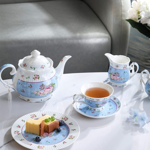 Tea Coffee Family Set for Mothers Day Coronation Party- 3 Tier Cake Stand, Teapot, Milk Jug, Sugar Bowl, 4 Plates, 4 Cups/ 4 Saucers (Blue)A very rare opportunity to acquire this party set at a discounted price- 3 Tier Cake Stand (£26.75)- 4 Cake Plates (26.75)- 4 Cups/ 4 Saucers (£42.75- Teapot, Milk Jug and Sugar Bowl (£54.75) Can buy it for £135- Saving £16Teapot, Milk jug and Sugar Bowl-Teapot sets come as 1 teapot with lid, 1 sugar bowl with lid and 1 Cream Milk Jug-Teapot with build in filter at end of the sprout, suitable for loose tea.-Teapot Sugar Bowl and Cream Milk Jug in white colour with shabby chic vintage design in blue and pink colour. Teapot sugar Bowl -and Milk Jug can be used separatly, in a same design lovely gift box, ideal for gift and present-Capacity of the Teapot 800ML. Size of the teapot: H13cm,diamater on top is 9cm3 TIER CAKE STAND- Porcelain cake plate stand- Bottom Plate: 26cm wide, Top Plate: 19cm wide, Height: 22cm-High Quality White Porcelain China with Victoria Style Flower-Same flower design of gift box-Silver Colour metal stand, not plastic4 Side dessert plates in 1 of each colour (Black, Blue, Turquoise, Pink)-Dimensions: 8 inches, 20cm with Wide Rimmed-Side dessert plates comes set of 4, same design in matching gift box-Plates are made of good quality of porcelain, glazed and decorated with rose butterfly birds-Presentable gift Box — Ideal gift for anyone any occasions-Dishwasher and microwave safe4 CUPS 4 SAUCERS-Cups and Saucers set include 4 cups and 4 saucers in Rose Blue-Cups and saucers set is in Beautiful gift box, Gift box cups ans saucers match design-Capacity of the cup: 220ml, Sizes:Cup Width10 x Depth 7cm, Saucer: Diameter 15cm-Cups and Saucers set is made of good quality of porcelain, decrated with touch of beautiful life-Dishwasher and microwave safe