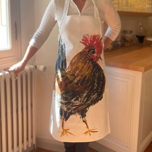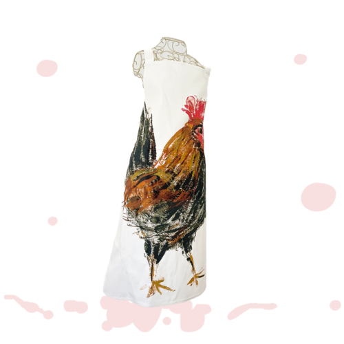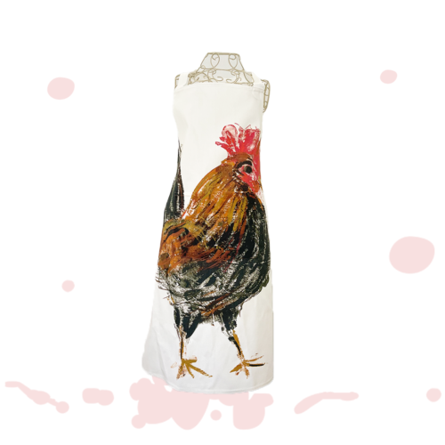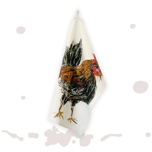 A soft, absorbent cotton tea towel with our perky rooster design created from our own paintings and drawings (zero stock libraries, zero generative AI) — easy to gift and simple to merchandise with matching aprons/cards.