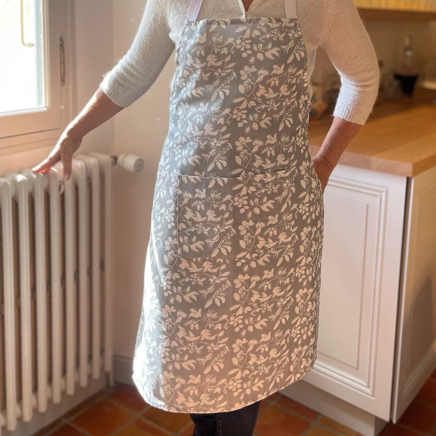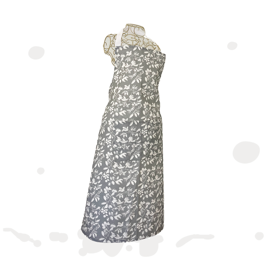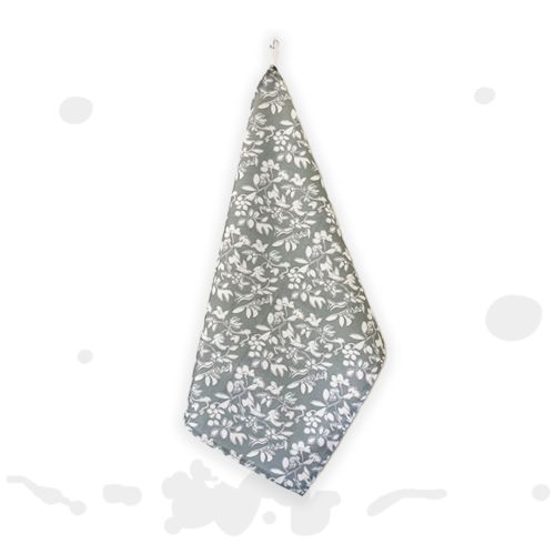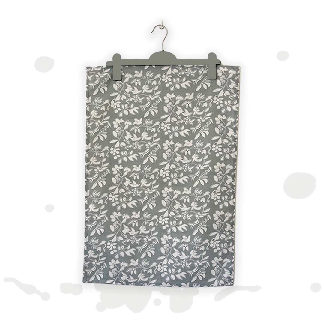 A soft, absorbent cotton tea towel with a simple white berries and birds design on a warm grey background. Created from our own paintings and drawings (zero stock libraries, zero generative AI) — easy to gift and simple to merchandise with matching aprons/cards.
