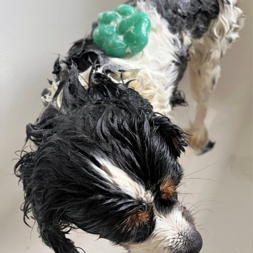 Remove the bar from the pod. Wet the dogs coat with lukewarm water. Rub the bar in circular motions to create a soft, gentle lather. Add more water to increase suds if necessary. Allow the lather to rest for a few minutes, if possible, to allow the key ingredients time to be absorbed. Rinse away. Let the bar air dry, then replace into the pod for the next time.