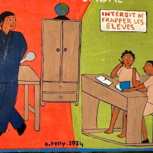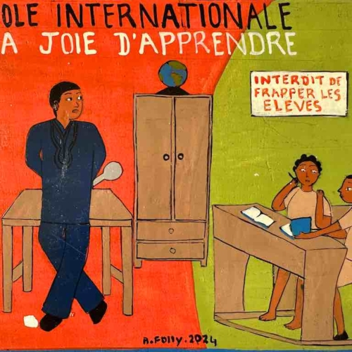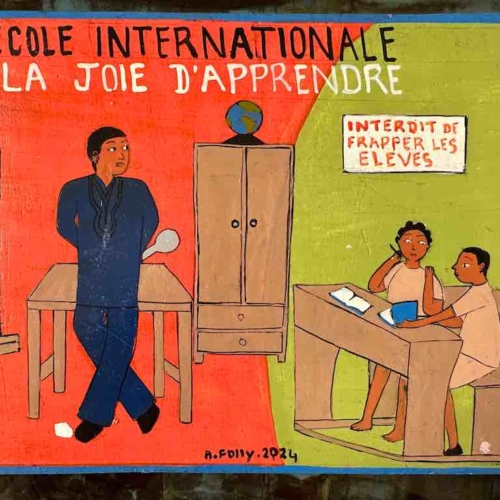 Hand Painted in Togo, Africa. This artist, A. Folly, sometimes features real-life scenarios in Africa with hyperbole added for comedic purposes. The artist sometimes produces paintings of fictional animals in funny ways, often driving a vehicle or riding a bike. The title of this original artwork is “International School. The Joy of Learning”. The white sign says, “It is prohibited to hit the students”.Each sign is 6.5 inches wide and 5 inches tall. The thickness of this painting is roughly 3/16″ or 4mm.This item is perfect for a wall hanging or as a flat object to be framed.