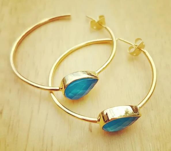 Teardrop Pendant Blue Chalcedony Gold Hoop Earrings