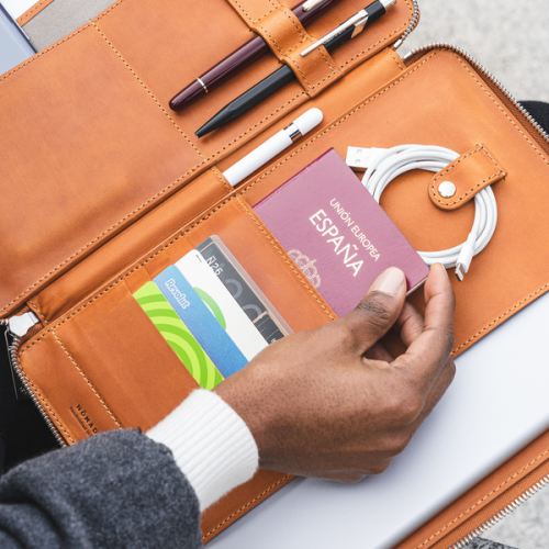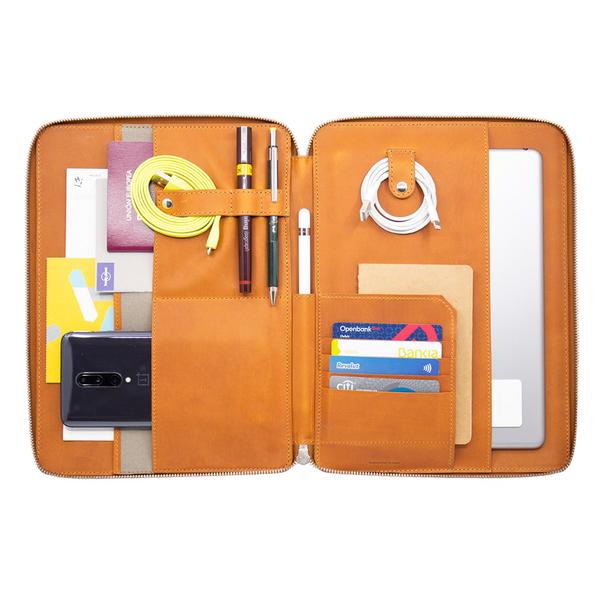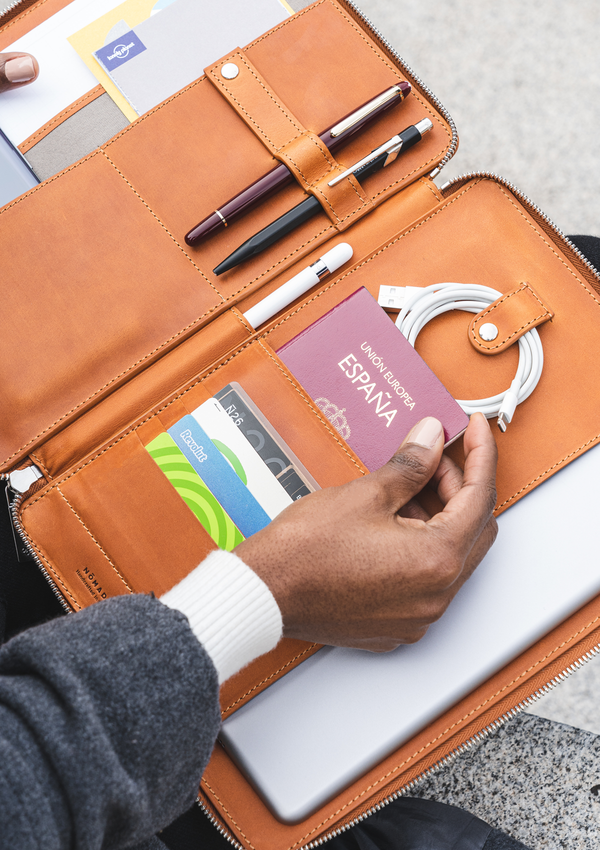 Designed to meet the demands of your day-to-day life and travels, our Tech Folio is handmade in Spain with vegetable tanned leather, 100% certified organic cotton and YKK zippers. Excella®. This functional accessory has 6 compartments to accommodate all kinds of gadgets and electronic components, from your tabletyour tablet, your headphones or any storage device. It also includes compartments to carry pens, cables, passport/notepad and multiple multiple cards. Our Tech Folio is your perfect ally for any occasion, but especially when you want to go even further.