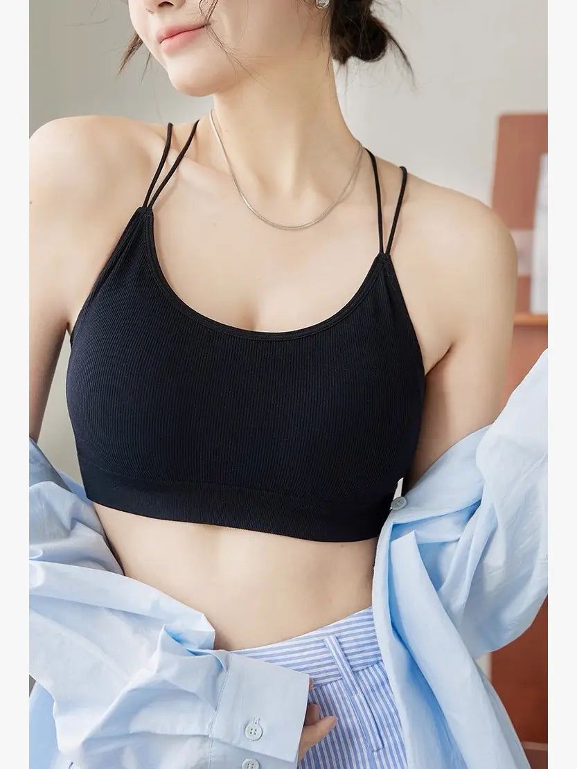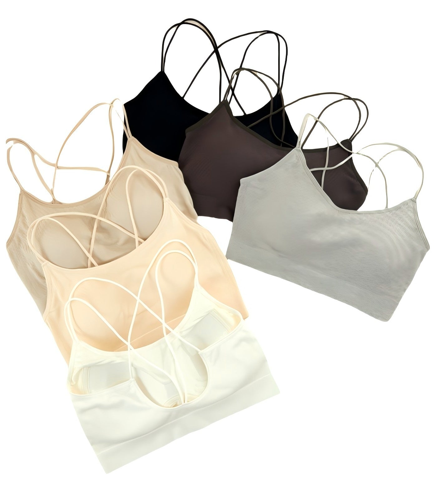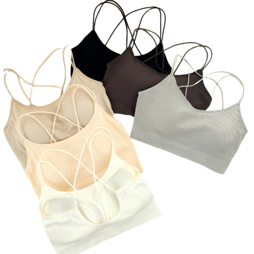 Perfect for:Fitness and loungewear brands, minimalist activewear labels, boutique yoga and barre studios, or influencer-led apparel lines looking for elegant low-impact designs. Key Features: Fabric: Second-skin feel microfiber blend, lightweight and breathable Design: Sleek V-neckline with a stylish crisscross open-back detail Support: Light compression and wireless comfort Straps: Ultra-thin elastic straps for a barely-there feel Built-in padding: Optional removable pads Colors: Black, Gold, Beige, White, Grey Sizes: Single Size Packaging Options: Standard: One pack(10 PCS, 2PCS/color, 5 colors in total) in a transparent OPP plastic bag Mixed Color Carton: 80 pcs Wholesale Terms: MOQ: 1 pack (10 PCS, 2 pcs each color,5 colors in total) OEM/ODM service available from 2,000 pcs with custom logo, color, or fabric Hangtags and packaging customization from 1,000 pcs Delivery Options: 2-4 Days In-stock fulfillment via New Jersey warehouse 2 Months Direct factory shipment from Morocco or China for bulk orders