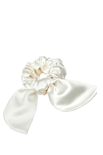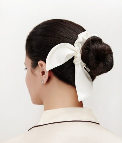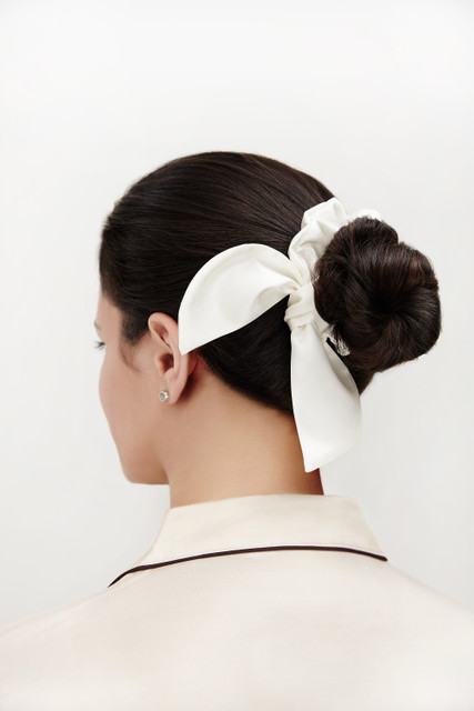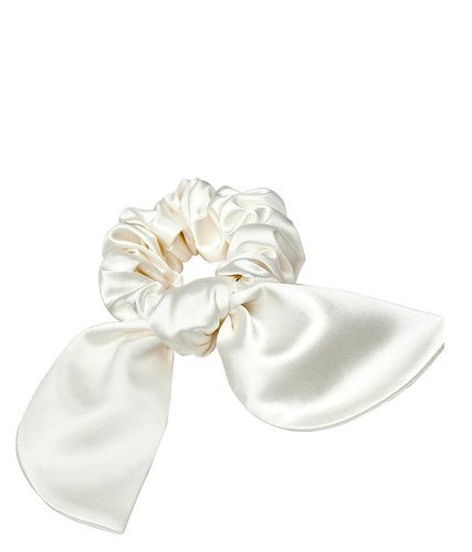 Chic and flirty bow detailed hair tie. Pure silk scrunchie holds hair up without tangling, denting, creasing or pulling at your hair, reducing breakage and split ends. Dress up your ponytail or low bun.