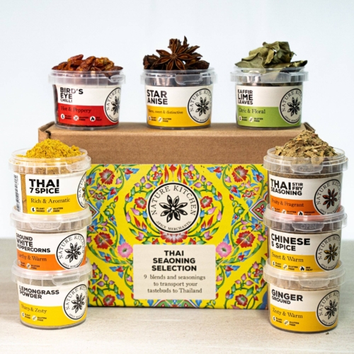 Thai Seasoning Selection This Box has a wonderfully eclectic selection of mouth-watering and punchy flavours. From Thailand and other parts of Asia. A perfect Gift for someone who is missing their travels to the Exotic East. Perfect for an evening entertaining friends and family. These clean fresh zesty spicy flavours are impossible to ignore * Dinner party favourite * Ideal gift for the well-travelled * Excellent for healthy meal prep * Gluten-free and Plant Based * Gift wrapped free of charge * Recipe Cards included * FREE DELIVERY TO MAINLAND UK Ingredients: White Pepper 50g Star Anis 26g, Lemon Grass Powder 40g, Bird Eye Chilli 20g Kaffir Lime Leaf 10g Ginger Ground 50g Chines 5 Spice (Cinnamon, Fennel, Black Pepper, Clove, Ginger, Star Anise).
