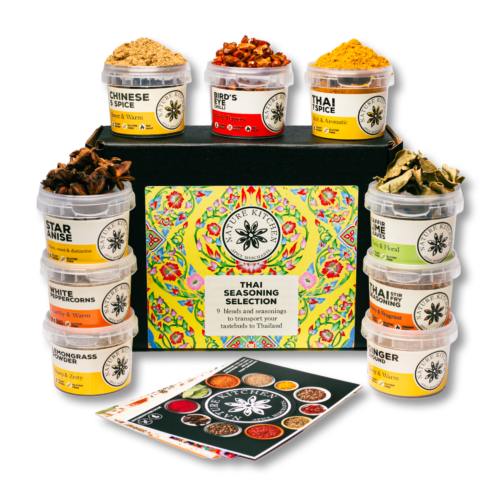 Thai Seasoning Selection This Box has a wonderfully eclectic selection of mouth-watering and punchy flavours. From Thailand and other parts of Asia. A perfect Gift for someone who is missing their travels to the Exotic East. Perfect for an evening entertaining friends and family. These clean fresh zesty spicy flavours are impossible to ignore * Dinner party favourite * Ideal gift for the well-travelled * Excellent for healthy meal prep * Gluten-free and Plant Based * Gift wrapped free of charge * Recipe Cards included * FREE DELIVERY TO MAINLAND UK Ingredients: White Pepper 50g Star Anis 26g, Lemon Grass Powder 40g, Bird Eye Chilli 20g Kaffir Lime Leaf 10g Ginger Ground 50g Chines 5 Spice (Cinnamon, Fennel, Black Pepper, Clove, Ginger, Star Anise).
