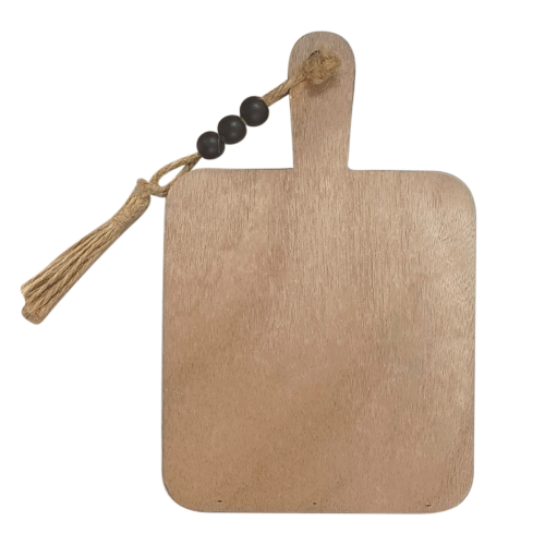 This charming coffee bar sign is decorated with a beautiful wooden bead garland and tassels, adding a touch of elegance and style to any space.