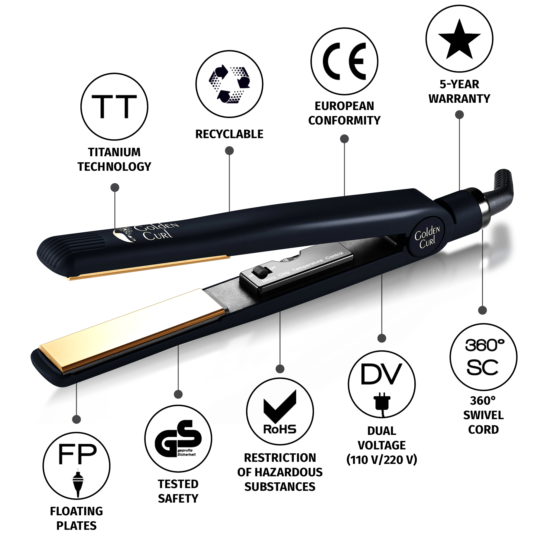 Dual Voltage (110v – 240v), Temperature Adjustment 230°C Max for Perfect, Damage-Free Hair Every Time, Everywhere!