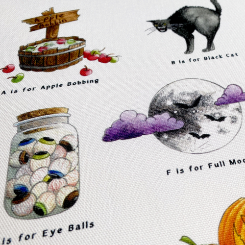 This premium cotton tea towel features 26 colourful Halloween themed illustrations.