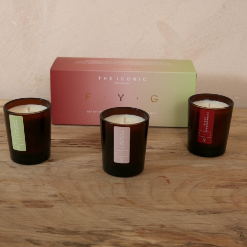 The Iconic Collection(Black Pomegranate, Peony & Blush Suede, Lime Basil & Mandarin)Meet our trio of freshly-fragranced minis from the popular Back to Basics range. Journeying from tangy Sicilian lime to fragrant peony with plum and on to juicy pomegranate tempered with spice, this elegant collection has been thoughtfully curated to celebrate luscious fruit and delicate florals – a must-have for those who delight in all things luxury. FYG candles are hand-poured, using a blend of natural, non-GMO Rapeseed and Coconut wax, all finished with a pure cotton wick. Presented in re-usable, recyclable amber glass, we proudly demonstrate our commitment to sustainability and the protection of the environment.Each set contains 3 x 75 gram votive travel size candles